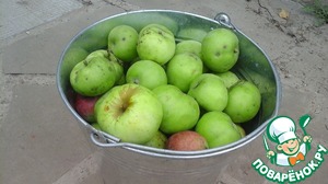 Основной ингредиент - яблоки. Они могут быть любого сорта, кислые, сладкие, большие, маленькие, битые, червивые, зеленые, спелые... Основное условие - не переспевшие и не мягкие. Я собрала такое ведро неказистой падалицы (все, что смогла отвоевать у наших лошадок)).