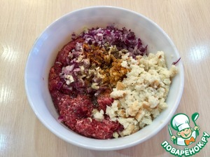 В процессе замешивания фарша все просто: мелко нарезанный лук, 2 зубчика чеснока, специи, батон, вымоченный в молоке хорошенько вымешать. Что касается батона: ничего страшного в корке я не вижу, в молоке и она отлично размокает. Специи, естественно, регулируем на свое усмотрение. Ставим в холодильник минут на 30.