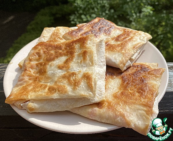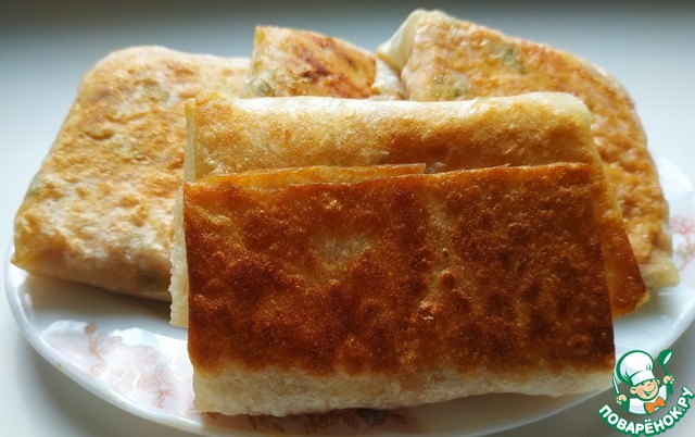 И заворачиваем конвертиком. Затем конвертики обжариваем с двух сторон на сковороде до золотистой корочки.