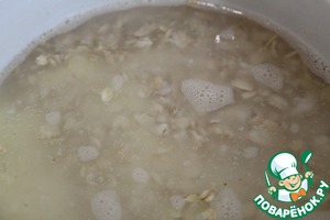 Замочить овсяные хлопья и манную крупу в бульоне или воде на 30 минут.