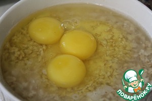В набухшую манку и хлопья добавить яйца и хорошо перемешать.