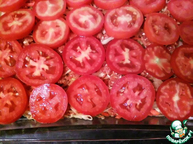 Нарезаем кружочками помидоры и раскладываем сверху. Отправляем противень в духовку. Включаем ее на температуру 180 градусов. На 30 минут.