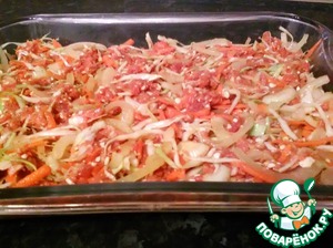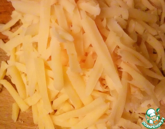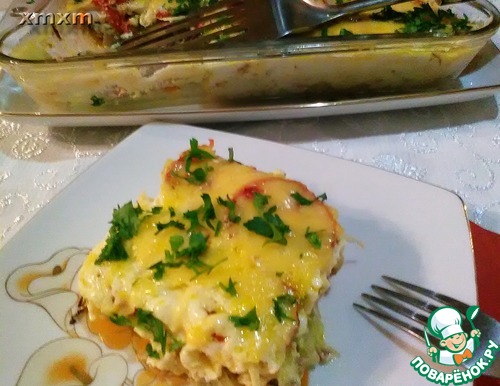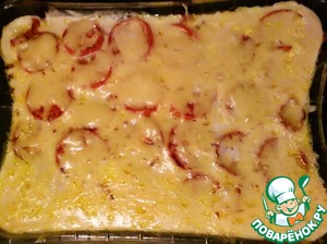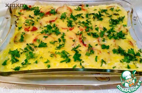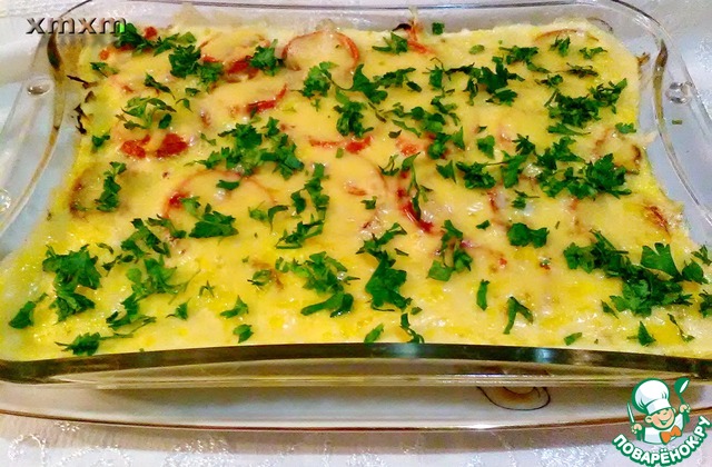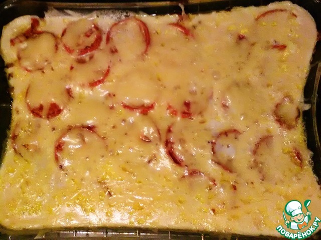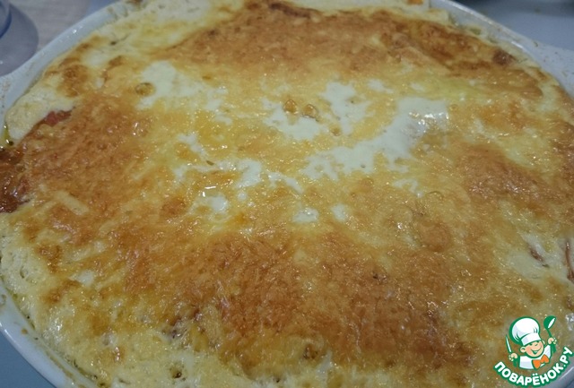 Удаляем фольгу с противня и посыпав сыром всю поверхность запеканки, заливаем яйцом. Снова отправляем запекаться еще на 20 минут.