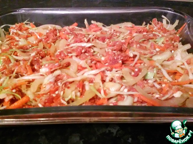 Полученную массу раскладываем равномерно в противень. Не утрамбовываем.