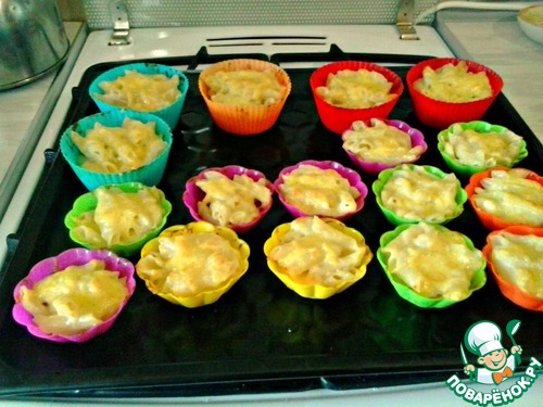 Выкладываем макароны в смазанные маслом формы для кексов, присыпаем сверху оставшимся сыром.