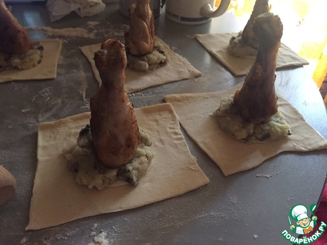 На каждый квадратик с начинкой выкладываем в центр куриную голень.