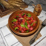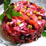 Казалось бы всем известный салат с традиционным набором ингредиентов, но если вы хотите придать блюду более насыщенный и пикантный вкус, предлагаю вам свой вариант приготовления этого всем известного салата. Этот салат для тех, кто любит острые блюда.