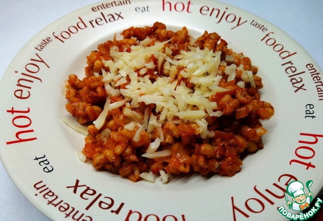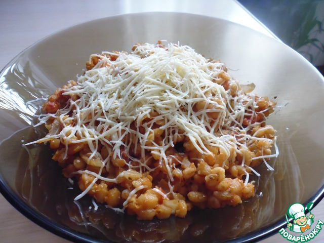Выложить в сковороду перловую крупу и тушить, помешивая, ещё минут 5. Сыр натереть на мелкой тёрке (отложить пару столовых ложек для подачи) и вмешать его в перлотто.