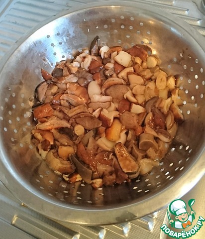 Отбрасываем отваренные грибы на дуршлаг и даем им стечь.