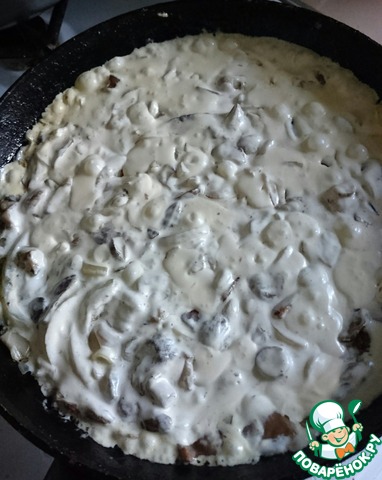 Теперь в грибы добавляем сметану, я к сметане добавляю еще немного майонеза, но если вы не едите майонез, то можно и без него.