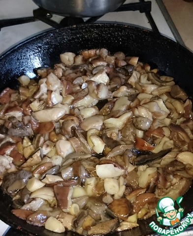 Теперь берем наши грибы и обжариваем их на сковороде. Повторюсь, если у вас вешка или шампиньоны, то их отваривать не нужно, вы их моете, режете и сразу обжариваете.