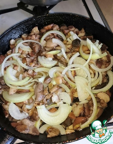 Обжариваем грибы минут 7 и добавляем нарезанный лук. Солим, перчим и хорошо все перемешиваем. Жарим еще 5 минут периодически помешивая.