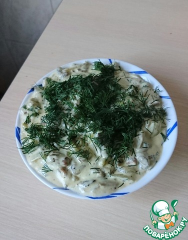 Теперь перекладываем грибы в пиалу и украшаем второй частью укропа.