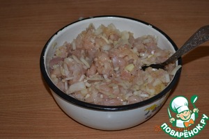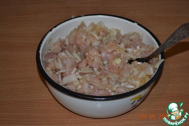 В это время порубить ножом курицу и лук, посолить, поперчить.