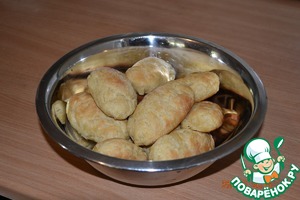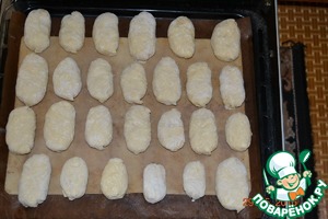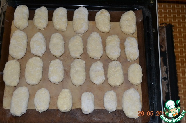 Достать тесто и лепить как пирожки, выкладывая на противень слегка смазанный растительным маслом, швом вниз.