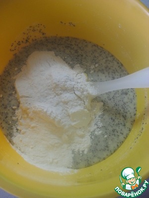 Добавляем просеянную муку с разрыхлителем. Перемешиваем тесто до однородного состояния. Тесто получается довольно густое.