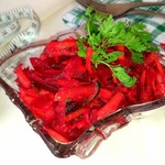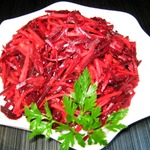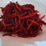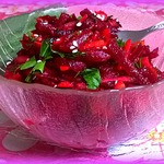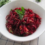 Незатейливый, сочный и симпатичный на вкус салат. Главную роль здесь играет пикантная свёкла, которая замечательно сочетается со свежими овощами. Такой салат точно не навредит фигуре и разнообразит постный стол..
