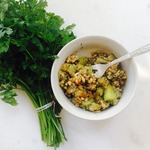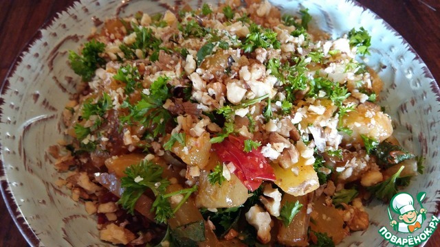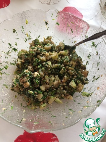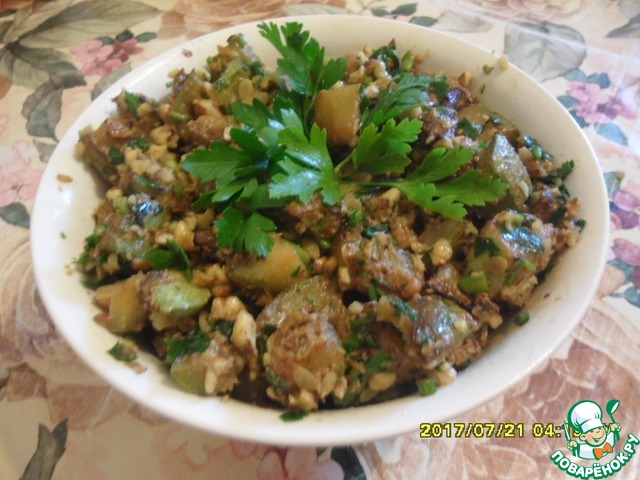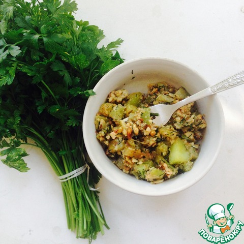 Смешать кабачки с орехами и петрушкой с чесноком. Добавить по вкусу соль и черный молотый перец. Заправить двумя столовыми ложками масла растительного.