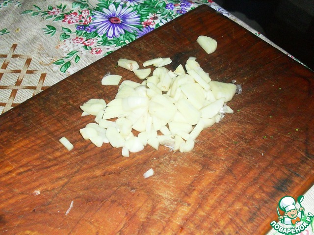 Тут же переворачиваем, весь чеснок перетаскиваем сверху на мясо.