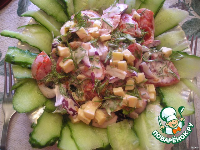 Выкладываем на тарелочку огуречные лепестки, на них - салатик.