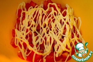 • Помидоры нарезать кубиками, промазать сеточкой майонеза.
