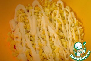 Яйцо также нарезать мелкими кубиками и промазать сеточкой майонеза.