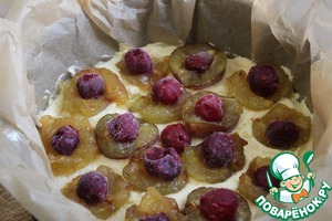 Выложить на тесто - вдавливать НЕ надо, срезом вверх и не вплотную друг к другу сливы, в середину каждой сливы я положила по вишенке.