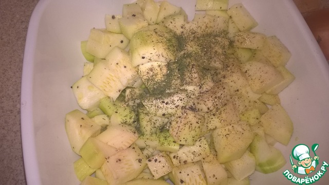 • Чистим и режем кабачок и приправляем солью, перцем и укропом (я забыл купит свежий ))).