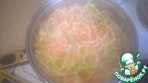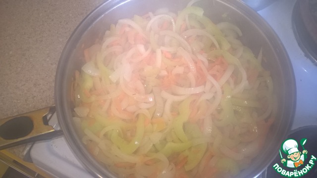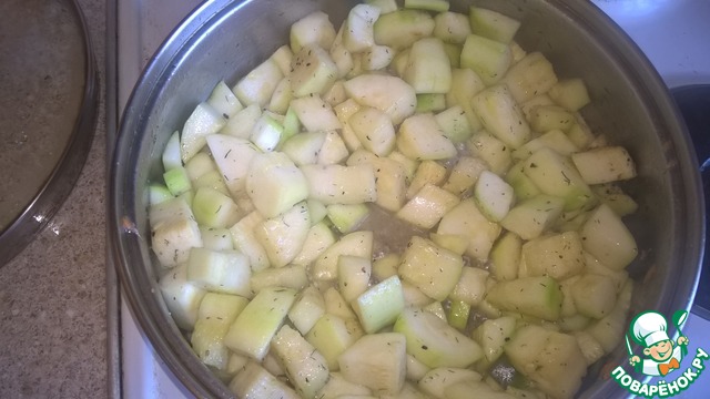 • Пока наше рагу томится, берем кабачок, выкладываем на сковородку и тушим до той готовности, какая вам нравится (я люблю чтобы кабачок хрустел).