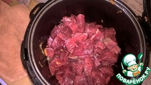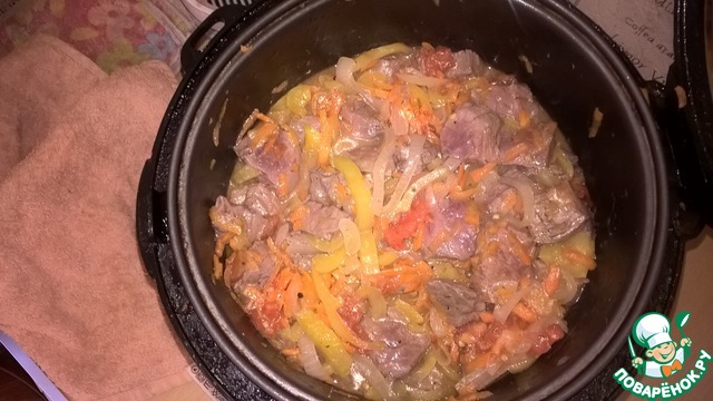 • Когда мясо немного поджарится, выкладываем овощи со сковороды. Добавляем немного воды и ставим тушиться на час-полтора.