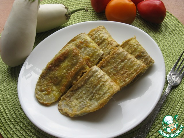 Обваливаем кусочек баклажана в муке, затем окунаем в яйцо - и на сковороду. -