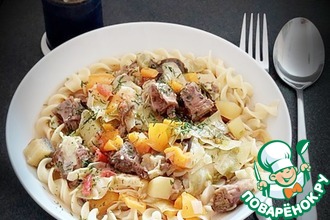 Берем мягкие помидоры и добавляем в сковороду с разогретым маслом и немного подавим помидоры, посолить и поперчить. Как закипели помидоры, выкладываем лук, перец и готовим на среднем огне. Через 5 минут выкладываем мясо, снова солим и перчим, закрываем крышкой и оставляем томиться на слабом огне 1-1,5 часа.