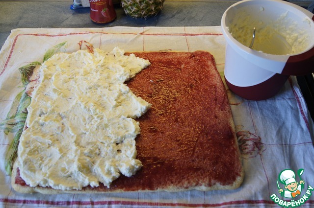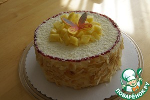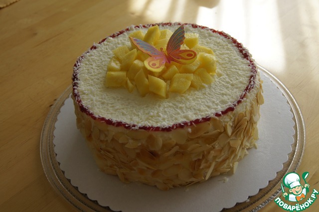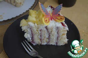 5. Сбрызнуть бисквит ананасовым соком (из банки) смешанным с ликёром. (Очень удобно это делать при помощи пульверизатора).