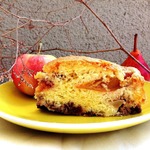 Дно формы застелить пергаментом, на дно выложить слой яблок, залить тонким слоем теста, посыпать рублеными орехами, вылить еще тонкий слой теста, снова слой яблок.
