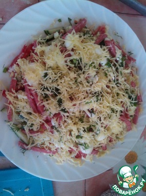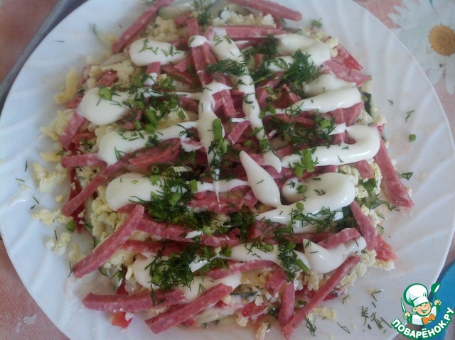 Колбасу так же нарезать тонкой соломкой и выложить на тертые яйца.