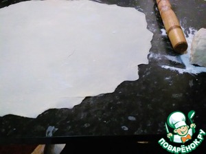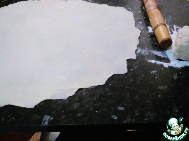Тесто делим на две равные части и по очереди раскатываем каждую, скалкой до очень тонкого пласта.