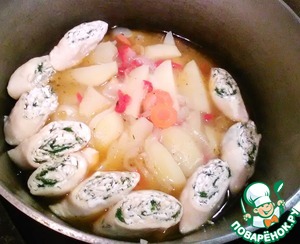 Аккуратно выкладываем штрудельки сверху картофеля, немного придавливая их в жидкость. -