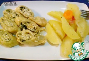 Аккуратно выкладываем порционо штрудельки и картофель.