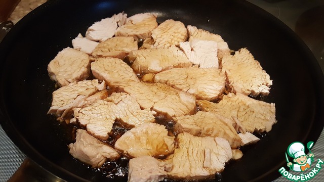 Отварную грудку нарезать поперёк ломтиками толщиной около 0.7-1.0 см. Также обжарить, как овощи.