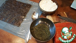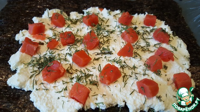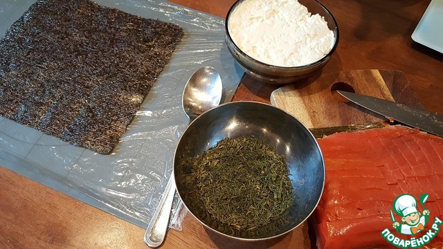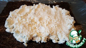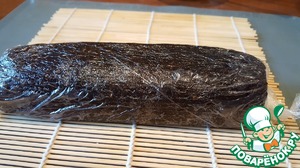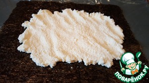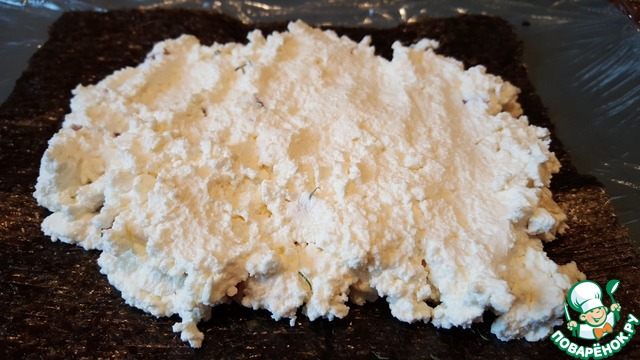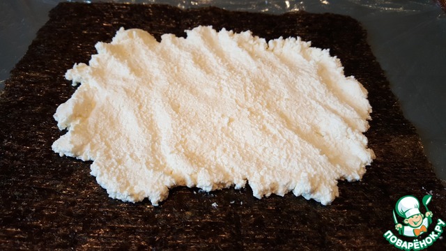 Я положила на плёнку лист нори, если Вам нори не нравится, просто выкладывайте сыр непосредственно на плёнку. -