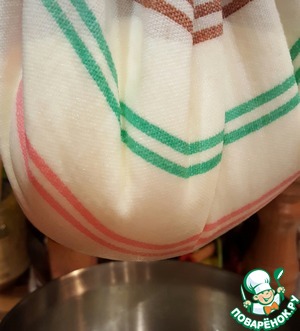 Когда сыворотка перестанет капать, снимаем полотенце и перекладываем сыр в подходящую ёмкость.
