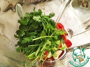Пока курочка подрумянивается, в блендере измельчите лук, чеснок, сладкий перец, кинзу, имбирь и чили (по желанию)