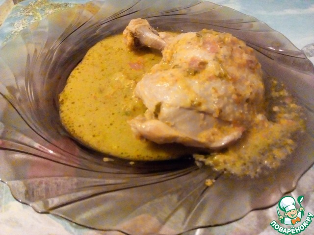 Оставьте на 45 минут, за это время курочку нужно пару раз перевернуть и снова облить получившимся соусом. Вот такую курочку мы положили в соус... За время приготовления в смеси кокосового молока и остальных ингредиентов курица напиталась ароматами и стала невероятно сочной и вкусной.