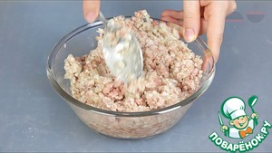 Начинка. Мясо и лук пропускаем через мясорубку, солим, хорошо перемешиваем. Добавляем воды, чтоб начинка была сочной и вкусной. Снова перемешиваем.
