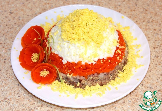 Из моркови можно вырезать маки, серединки цветов выполнены из натертого на терке яичного желтка.