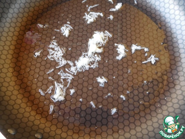 Обжариваем на растительном масле чеснок, натертый на мелкой терке (пару минут).
