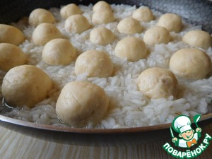 Рис перемешиваем и выкладываем на него шарики. Добавляем оставшийся бульон, доводим до кипения. Опять убавляем огонь до минимума и, не открывая крышки, доводим до готовности. Это займет примерно 15 минут.