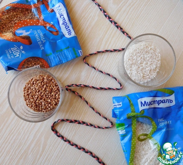 Берем крупы от фирмы "Мистраль", заливаем их водой и ставим на огонь. Как только вода закипит, убавляем огонь до минимума, солим, накрываем крышкой и оставляем готовиться до полного впитывания воды.