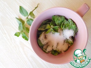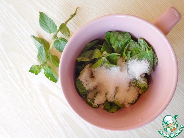 В это время берем мяту (небольшие веточки, как на фото), обрываем листочки и растираем с сахаром.