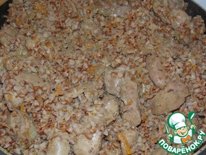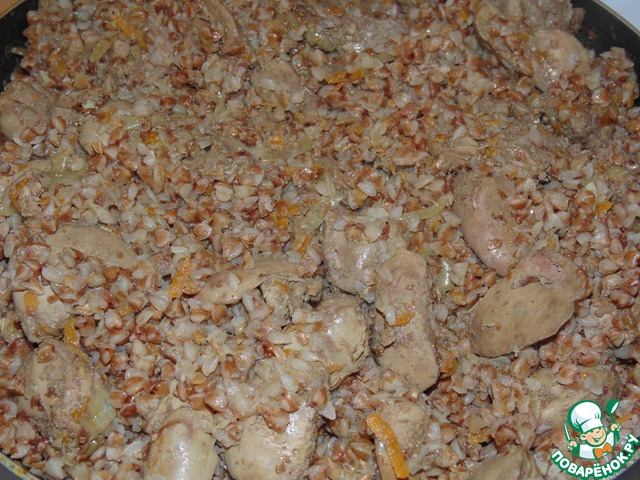 Когда печень будет почти готова, выложить к ней готовую гречку.